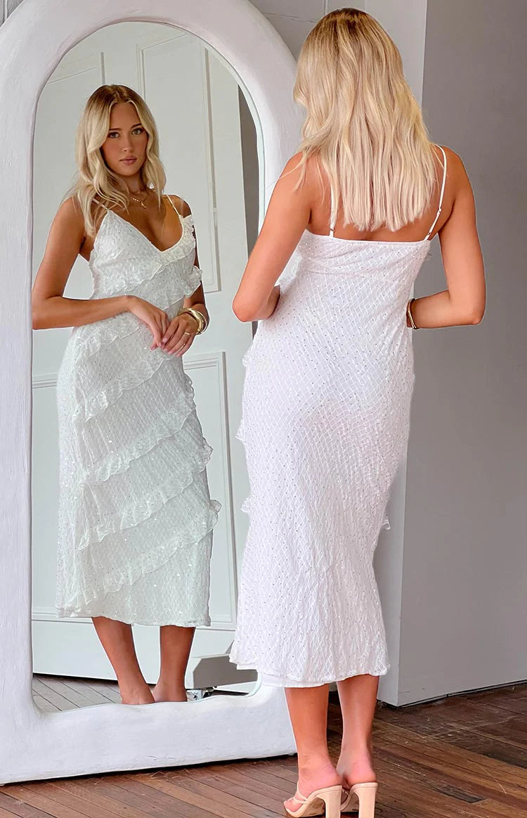 Look angelic in our Hudson White Ruffle ! Pair with and to tie the look all together for your next night out!